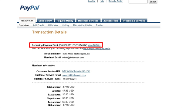 - On the next page (Transaction Details), look for the line that says 'Recurring Payment Sent' and click on 'View Details'.